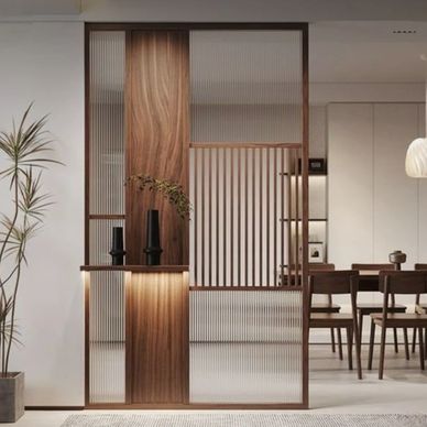 Fluted panel partitions bring a modern, luxurious feel to any space. The vertical grooves add height and depth, making them perfect as statement dividers between living, dining, or foyer areas. They can be paired with lights, glass, or wooden elements for a high-end look.