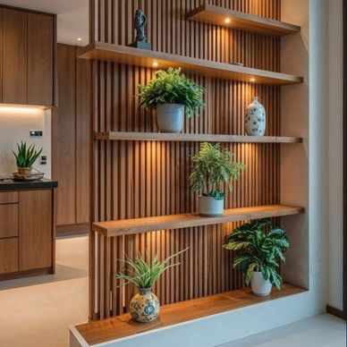 This stylish partition doubles as a shelving unit, allowing you to display decor, plants, books, or artifacts while subtly dividing spaces. It keeps rooms visually connected yet structurally separate. A practical and beautiful option for living rooms, dining areas, and hallways.